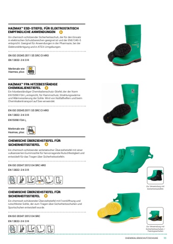 CHEMIKALIENSCHUTZSCHUHE 11HAZMAX™ ESD-STIEFEL FÜR ELEKTROSTATISCH EMPFINDLICHE ANWENDUNGENHAZMAX™ FPA HITZEBESTÄNDIGE CHEMIKALIENSTIEFELCHEMISCHE ÜBERZIEHSTIEFEL FÜR SICHERHEITSSTIEFELCHEMISCHE ÜBERZIEHSTIEFEL FÜR SICHERHEITSSTIEFELEin chemisch schützender Sicherheitsschuh, der für den Einsatz in elektrischen Schutzbereichen geeignet ist und der EN61340-5 entspricht. Geeignet für Anwendungen in der Pharmazie, bei der Elektronikfertigung und in ATEX-Umgebungen.EN ISO 20345:2011 S5 SRC CI HROEN 13832-3 K O REin hitzebeständiger Chemikalienschutz-Stiefel, der der Norm EN15090 F3A I3 entspricht, für Flammschutz, Strahlungswärme und Wärmeisolierung der Sohle. Wird von Notfallhelfern und beim Chemikalientransport auf See verwendet.EN ISO 20345:2011 S5 SRC CI HROEN 13832-3 K O REN15090 F3A I3Ein chemisch schützender antistatischer Überziehstiefel mit einer vulkanisierten Gummisohle für hervorragende Rutschfestigkeit und entwickelt für das Tragen über Sicherheitsstiefeln. EN ISO 20347:2012 O4 SRC HROEN 13832-3 K O REin chemisch schützender Überziehstiefel mit Frontöffnung und rutschfester Sohle, der zum Tragen über Sicherheitsschuhen und Sportschuhen entwickelt wurde.EN ISO 20347:2012 O4 SRCEN 13832-3 K O RSRCSRCMerkmale wie Hazmax, plus:Merkmale wie Hazmax, plus: F3AO4O4Zur Verwendung mit SicherheitsstiefelnZur Verwendung mit Sicherheitsschuhen / Trainingsschuhen