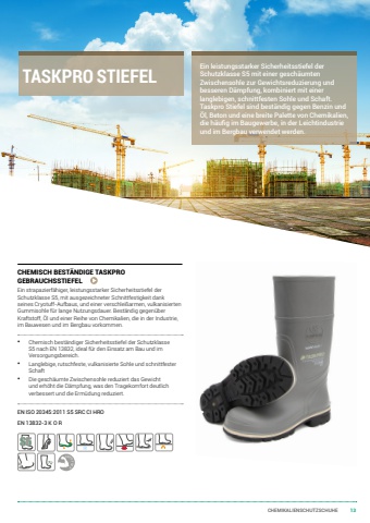 CHEMIKALIENSCHUTZSCHUHE 13CHEMISCH BESTÄNDIGE TASKPRO GEBRAUCHSSTIEFELEin strapazierfähiger, leistungsstarker Sicherheitsstiefel der Schutzklasse S5, mit ausgezeichneter Schnittfestigkeit dank seines Cryotuff-Aufbaus, und einer verschleißarmen, vulkanisierten Gummisohle für lange Nutzungsdauer. Beständig gegenüber Kraftstoff, Öl und einer Reihe von Chemikalien, die in der Industrie, im Bauwesen und im Bergbau vorkommen.• Chemisch beständiger Sicherheitsstiefel der Schutzklasse S5 nach EN 13832, ideal für den Einsatz am Bau und im Versorgungsbereich.• Langlebige, rutschfeste, vulkanisierte Sohle und schnittfester Schaft• Die geschäumte Zwischensohle reduziert das Gewicht und erhöht die Dämpfung, was den Tragekomfort deutlich verbessert und die Ermüdung reduziert.EN ISO 20345:2011 S5 SRC CI HROEN 13832-3 K O REin leistungsstarker Sicherheitsstiefel der Schutzklasse S5 mit einer geschäumten Zwischensohle zur Gewichtsreduzierung und besseren Dämpfung, kombiniert mit einer langlebigen, schnittfesten Sohle und Schaft. Taskpro Stiefel sind beständig gegen Benzin und Öl, Beton und eine breite Palette von Chemikalien, die häufig im Baugewerbe, in der Leichtindustrie und im Bergbau verwendet werden.TASKPRO STIEFELS5CRYOTUFSRC F