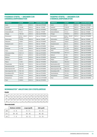 CHEMIKALIENSCHUTZSCHUHE 15CHEMIKALIE CAS-NR. METHODE DURCHBRUCHZEITAzeton 67-64-1 EN374-3 Mehr als 0,5 STUNDEAcetonitril 75-05-08 EN374-3 Mehr als 1 STUNDEAmmoniakgas 7664-41-7 EN374-3 Mehr als 4 STUNDENKohlenstoffdisulfid 75-15-0 EN374-3 Mehr als 1 STUNDEChlorgas 7782-50-5 EN374-3 Mehr als 8 STUNDENDichlorbenzol 95-50-1, 106-46-7, 541-73-1EN374-3 Mehr als 7 STUNDENDichlormethan 75-09-02 EN374-3 Mehr als 1 STUNDEDiethylamin 109-89-7 EN374-3 Mehr als 2 STUNDENDimethylformamid 68-12-2 EN374-3 Mehr als 1 STUNDEEthanol 64-17-5 EN374-3 Mehr als 8 STUNDENEthylacetat 141-78-6 EN374-3 Mehr als 2 STUNDENHexan 110-54-3 EN374-3 Mehr als 3 STUNDENChlorwasserstoffgas 7647-01-0 EN374-3 Mehr als 8 STUNDENMilchsäure 50-21-5 EN374-3 Mehr als 8 STUNDENMethanol 67-56-1 EN374-3 Mehr als 4 STUNDENNitrobenzol 98-95-3 EN374-3 Mehr als 8 STUNDENÖlsäure 112-80-1 EN374-3 Mehr als 7 STUNDENPhosphorsäure 7664-38-2 EN374-3 Mehr als 8 STUNDENKaliumhydroxid 40% 1310-58-3 EN374-3 Mehr als 8 STUNDENNatriumhydroxid 40% 1310-73-2 EN374-3 Mehr als 8 STUNDENNatriumhypochlorit 16% 7681-52-9 EN374-3 Mehr als 8 STUNDENSchwefelsäure 96% 7664-93-9 EN374-3 Mehr als 8 STUNDENTetrachlorethylen 127-18-4 EN374-3 Mehr als 2 STUNDENTetrahydofuran 109-99-9 EN374-3 Mehr als 0,5 STUNDENToluol 108-88-3 EN374-3 Mehr als 3 STUNDENCHEMIKALIE CAS-NR. METHODE DURCHBRUCHZEITAzeton 67-64-1 EN374-3 Mehr als 0,5 STUNDEAcetonitril 75-05-08 EN374-3 Mehr als 1 STUNDEAmmoniakgas 7664-41-7 EN374-3 Mehr als 4 STUNDENKohlenstoffdisulfid 75-15-0 EN374-3 Mehr als 1 STUNDEChlorgas 7782-50-5 EN374-3 Mehr als 8 STUNDENDichlorbenzol 95-50-1, 106-46-7, 541-73-1EN374-3 Mehr als 7 STUNDENDichlormethan 75-09-02 EN374-3 Mehr als 1 STUNDEDiethylamin 109-89-7 EN374-3 Mehr als 2 STUNDENDimethylformamid 68-12-2 EN374-3 Mehr als 1 STUNDEEthanol 64-17-5 EN374-3 Mehr als 8 STUNDENEthylacetat 141-78-6 EN374-3 Mehr als 2 STUNDENHexan 110-54-3 EN374-3 Mehr als 3 STUNDENChlorwasserstoffgas 7647-01-0 EN374-3 Mehr als 8 STUNDENMethanol 67-56-1 EN374-3 Mehr als 4 STUNDENNitrobenzol 98-95-3 EN374-3 Mehr als 8 STUNDENÖlsäure 112-80-1 EN374-3 Mehr als 7 STUNDENPhosphorsäure 7664-38-2 EN374-3 Mehr als 8 STUNDENKaliumhydroxid 40% 1310-58-3 EN374-3 Mehr als 8 STUNDENNatriumhydroxid 40% 1310-73-2 EN374-3 Mehr als 8 STUNDENNatriumhypochlorit 16% 7681-52-9 EN374-3 Mehr als 8 STUNDENSchwefelsäure 96% 7664-93-9 EN374-3 Mehr als 8 STUNDENTetrachlorethylen 127-18-4 EN374-3 Mehr als 2 STUNDENTetrahydofuran 109-99-9 EN374-3 Mehr als 0,5 STUNDENToluol 108-88-3 EN374-3 Mehr als 3 STUNDENFOODMAX STIEFEL — ANGABEN ZUR CHEMIKALIENPERMEATIONTASKPRO STIEFEL — ANGABEN ZUR CHEMIKALIENPERMEATIONWORKMASTER™ ANLEITUNG ZUR STIEFELGRÖSSEMedium (mittel) Large (groß) Sehr großGB 6 - 8 9 - 11 12 - 15EU 39 - 42 43 - 45 46 - 50US 7 - 9 10 - 12 13 - 16GB 3 4 5 6 7 8 9 10 11 12 13 14 15EU 35 36 37 39 41 42 43 44 45 46 47 49 50US 4 5 6 7 8 9 10 11 12 13 14 15 16StiefelÜberziehstiefel