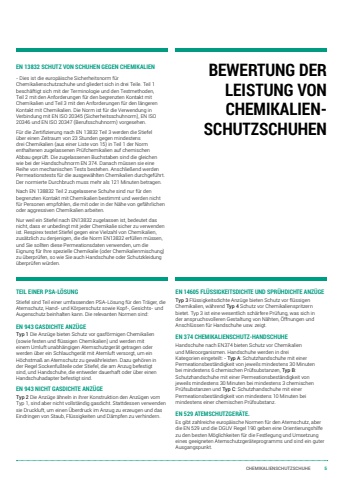 CHEMIKALIENSCHUTZSCHUHE 5BEWERTUNG DER LEISTUNG VON CHEMIKALIENSCHUTZSCHUHENEN 13832 SCHUTZ VON SCHUHEN GEGEN CHEMIKALIEN- Dies ist die europäische Sicherheitsnorm für Chemikalienschutzschuhe und gliedert sich in drei Teile. Teil 1 beschäftigt sich mit der Terminologie und den Testmethoden, Teil 2 mit den Anforderungen für den begrenzten Kontakt mit Chemikalien und Teil 3 mit den Anforderungen für den längeren Kontakt mit Chemikalien. Die Norm ist für die Verwendung in Verbindung mit EN ISO 20345 (Sicherheitsschuhnorm), EN ISO 20346 und EN ISO 20347 (Berufsschuhnorm) vorgesehen.Für die Zertifizierung nach EN 13832 Teil 3 werden die Stiefel über einen Zeitraum von 23 Stunden gegen mindestens drei Chemikalien (aus einer Liste von 15) in Teil 1 der Norm enthaltenen zugelassenen Prüfchemikalien auf chemischen Abbau geprüft. Die zugelassenen Buchstaben sind die gleichen wie bei der Handschuhnorm EN 374. Danach müssen sie eine Reihe von mechanischen Tests bestehen. Anschließend werden Permeationstests für die ausgewählten Chemikalien durchgeführt. Der normierte Durchbruch muss mehr als 121 Minuten betragen. Nach EN 138832 Teil 2 zugelassene Schuhe sind nur für den begrenzten Kontakt mit Chemikalien bestimmt und werden nicht für Personen empfohlen, die mit oder in der Nähe von gefährlichen oder aggressiven Chemikalien arbeiten. Nur weil ein Stiefel nach EN13832 zugelassen ist, bedeutet das nicht, dass er unbedingt mit jeder Chemikalie sicher zu verwenden ist. Respirex testet Stiefel gegen eine Vielzahl von Chemikalien, zusätzlich zu denjenigen, die die Norm EN13832 erfüllen müssen, und Sie sollten diese Permeationsdaten verwenden, um die Eignung für Ihre spezielle Chemikalie (oder Chemikalienmischung) zu überprüfen, so wie Sie auch Handschuhe oder Schutzkleidung überprüfen würden. TEIL EINER PSA-LÖSUNGStiefel sind Teil einer umfassenden PSA-Lösung für den Träger, die Atemschutz, Hand- und Körperschutz sowie Kopf-, Gesichts- und Augenschutz beinhalten kann. Die relevanten Normen sind:EN 943 GASDICHTE ANZÜGETyp 1 Die Anzüge bieten Schutz vor gasförmigen Chemikalien (sowie festen und flüssigen Chemikalien) und werden mit einem Umluft unabhängigen Atemschutzgerät getragen oder werden über ein Schlauchgerät mit Atemluft versorgt, um ein Höchstmaß an Atemschutz zu gewährleisten. Dazu gehören in der Regel Sockenfußteile oder Stiefel, die am Anzug befestigt sind, und Handschuhe, die entweder dauerhaft oder über einen Handschuhadapter befestigt sind.EN 943 NICHT GASDICHTE ANZÜGE Typ 2 Die Anzüge ähneln in ihrer Konstruktion den Anzügen vom Typ 1, sind aber nicht vollständig gasdicht. Stattdessen verwenden sie Druckluft, um einen Überdruck im Anzug zu erzeugen und das Eindringen von Staub, Flüssigkeiten und Dämpfen zu verhindern.EN 14605 FLÜSSIGKEITSDICHTE UND SPRÜHDICHTE ANZÜGETyp 3 Flüssigkeitsdichte Anzüge bieten Schutz vor flüssigen Chemikalien, während Typ 4 Schutz vor Chemikalienspritzern bietet. Typ 3 ist eine wesentlich schärfere Prüfung, was sich in der anspruchsvolleren Gestaltung von Nähten, Öffnungen und Anschlüssen für Handschuhe usw. zeigt. EN 374 CHEMIKALIENSCHUTZ-HANDSCHUHEHandschuhe nach EN374 bieten Schutz vor Chemikalien und Mikroorganismen. Handschuhe werden in drei Kategorien eingeteilt: - Typ A: Schutzhandschuhe mit einer Permeationsbeständigkeit von jeweils mindestens 30 Minuten bei mindestens 6 chemischen Prüfsubstanzen, Typ B: Schutzhandschuhe mit einer Permeationsbeständigkeit von jeweils mindestens 30 Minuten bei mindestens 3 chemischen Prüfsubstanzen und Typ C: Schutzhandschuhe mit einer Permeationsbeständigkeit von mindestens 10 Minuten bei mindestens einer chemischen Prüfsubstanz. EN 529 ATEMSCHUTZGERÄTE. Es gibt zahlreiche europäische Normen für den Atemschutz, aber die EN 529 und die DGUV Regel 190 geben eine Orientierungshilfe zu den besten Möglichkeiten für die Festlegung und Umsetzung eines geeigneten Atemschutzgeräteprogramms und sind ein guter Ausgangspunkt.