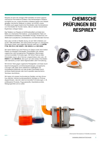 CHEMIKALIENSCHUTZSCHUHE 7CHEMISCHE PRÜFUNGEN BEI RESPIREX™Respirex ist einer der wenigen PSA-Hersteller mit einem eigenen chemischen Permeations-Prüflabor. Das betriebseigene Testlabor ermöglicht es uns, unsere Produkte umfassend gegen eine Vielzahl gängiger chemischer Gefahren zu testen; wir können unsere Produkte auch gegen bestimmte Chemikalien oder Kombinationen von Chemikalien für Kunden testen, falls wir darüber derzeit keine Ergebnisse vorliegen haben.Das Testlabor von Respirex ist UKAS-akkreditiert und bietet eine Reihe von chemischen Permeations- und physikalischen Tests von Chemikalienschutzkleidung, einschließlich Anzüge, Handschuhe und Stiefel nach europäischen, amerikanischen und internationalen Normen.Das Labor mit Sitz in Redhill, Surrey, ist seit 1994 in Betrieb und wurde 1996 akkreditiert. Die Laboruntersuchungen zur chemischen Permeation finden nach folgenden Normen statt wie z. B: ASTM F739, EN 374-3, EN 16523-1, EN 16523-2 and ISO 6529. Wir haben Erfahrung in der Prüfung von Gasen sowie einer breiten Palette von flüssigen Chemikalien, einschließlich der meisten organischen oder anorganischen Flüssigkeiten, Mischungen und kommerziellen Formulierungen. Wir führen Tests an allen Chemikalien durch, die in Normen vorgeschrieben sind, wie z. B. EN374-1 oder EN 943-2, aber auch auf viele andere Chemikalien oder Gemische, je nach deren Eigenschaften oder Formulierung.Wir können Tests gegen organische Flüssigkeiten und Gase durch Gaschromatographie und Infrarotspektroskopie, anorganische Lösungen oder Gase durch elektrische Leitfähigkeit und ionenselektive Elektrode und viele andere Chemikalien durch sichtbare Spektroskopie oder durch spezielle nasschemische Techniken durchführen.Wir haben mit unseren hochmodernen Geräten und dem Knowhow dahinter mehrere kundenspezifische Verträge zur Prüfung abgeschlossen, darunter viele kommerzielle Formulierungen, z. B. erdölbasierte Produkte, Flugzusatzstoffe, Desinfektionsmittel, Reinigungsmittel und so weiter. Chemische Permeations-Prüfzelle (montiert)