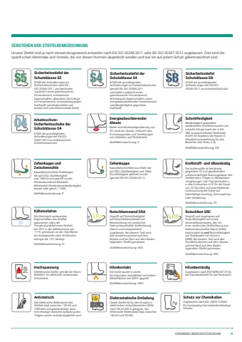 CHEMIKALIENSCHUTZSCHUHE 9VERSTEHEN DER STIEFELKENNZEICHNUNGUnsere Stiefel sind je nach Verwendungszweck entweder nach EN ISO 20345:2011 oder EN ISO 20347:2012 zugelassen. Dies sind die spezifischen Merkmale und Vorteile, die von diesen Normen abgedeckt werden und wie sie auf jedem Schuh gekennzeichnet sind.Elektrostatische EntladungDieser Stiefel ist für den Einsatz in elektrischen Schutzbereichen (EPA) nach EN 61340-5 geeignet. Der elektrische Widerstand liegt zwischen 100 kΩ und 35 MΩ.HochspannungDielektrische Stiefel, gemäß der Norm EN50321 für elektrisch isolierendes Schuhwerk.KälteisolationDie thermisch isolierenden Eigenschaften des Stiefels garantieren, dass der Temperaturabfall eines Stiefels bei 23oC in der Kältekammer bei -17oC gemessen an der Oberfläche der Einlegesohle nach 30 Minuten weniger als 10oC beträgt.Stiefelkennzeichnung: CIRutschhemmend SRAGeprüft auf Rutschfestigkeit auf Keramikfliesenböden bei Beschichtung mit verdünnter Natriumlaurylsulfat-Seifenlösung (NaLS) und entsprechend zugelassen. Bei diesem Test wird das Vorwärtsrutschen auf dem Absatz und bei flach auf dem Boden liegendem Stiefel gemessen. Stiefelkennzeichnung: SRASRARutschfest SRCGeprüft und zugelassen auf Rutschfestigkeit auf einem Keramikfliesenboden, der mit einer verdünnten Seifenlösung aus Natriumlaurylsulfat (NaLS) [SRA] beschichtet ist,und Rutschfestigkeit auf Stahlboden mit Glycerin [SRB]. Bei diesem Test wird das Vorwärtsrutschen auf dem Absatz und bei flach auf dem Boden liegendem Stiefel gemessen. Stiefelkennzeichnung: SRCSRCKraftstoff- und ölbeständigDie Außensohle ist beständig gegenüber Öl und gewährleistet unbeeinträchtigte Nutzungsdauer des Stiefels beim Tragen in ölbelasteten Umgebungen. Der Test beinhaltet u. a. das Eintauchen in Öl für die Dauer von 22 Stunden und anschließende Untersuchung der Sohle auf übermäßige Quellung, Schrumpfung oder Verhärtung. Stiefelkennzeichnung: FOSicherheitsstiefel der Schutzklasse S5Erfüllt die Anforderungen an Sicherheitsschuhe nach EN ISO 20345:2011 und beinhaltet zusätzlich einen geschlossenen Fersenbereich, antistatische Eigenschaften, absorbiert die Energie im Fersenbereich, ist beständig gegen Kraftstoff, penetrationsfest und besitzt eine rutschhemmende Sohle.S5 Sicherheitsstiefel der Schutzklasse S4Erfüllt die grundlegenden Anforderungen an Sicherheitsschuhe gemäß EN ISO 20345:2011 und bietet zusätzlich einen geschlossenen Fersenbereich, antistatische Eigenschaften, einen energieabsorbierenden Fersenbereich und Beständigkeit gegenüber Kraftstoff.S4 Sicherheitsstiefel Schutzklasse SBErfüllt die grundlegenden Anforderungen der EN ISO 20345:2011 an Sicherheitsschuhe.SBArbeitsschutzSicherheitsschuhe der Schutzklasse O4Erfüllt die grundlegenden Anforderungen der EN ISO 20347:2012 an ArbeitsschutzSicherheitsschuhe.O4HitzebeständigZugelassen nach EN15090:2012 F3A, F3A der Standardstiefel für die Feuerwehr.Schutz vor ChemikalienZugelassen nach EN 13832-3:2006 für hochgradig chemikalienbeständige Schuhe.SchnittfestigkeitBeständigkeit gegenüber wiederholten Schnittversuchen mit scharfer Klinge (nach der in EN 388 vorgeschriebenen Methode). Erzielt ein Ergebnis der Klasse 4 (Mindestvoraussetzung für das Bestehen des Tests: 2.5).Stiefelkennzeichnung: CREnergieabsorbierender AbsatzBietet eine Mindestabpolsterung von 20 Joule am Absatz, reduziert das Ermüdungsrisiko und Verletzungen von Gelenken und Wirbelsäule.Stiefelkennzeichnung: EAntistatischDer elektrische Widerstand des Stiefels liegt zwischen 100 kΩ und 1000 MΩ und gewährleistet, dass eine etwaige statische Aufladung des Trägers sicher zu Erde abgeleitet wird.Zehenkappe und ZwischensohleEpoxidbeschichtete Stahlkappe, die auf 200J Stoßfestigkeit und 15kN Druck geprüft wurde. Penetrationsfeste EdelstahlMittelsohle, Penetrationsbeständigkeit besser oder gleich 1100N.Stiefelkennzeichnung: PZehenkappeEpoxidbeschichtete aus Stahl, die auf 200J Stoßfestigkeit und 15kN Druckfestigkeit getestet wurde (gemäß DE ISO 20345:2011)HitzekontaktDie Sohle wurde in einem 60-Sekunden-Kontakttest mit heißen Metallflächen bei 300oC geprüft.Stiefelkennzeichnung: HRO